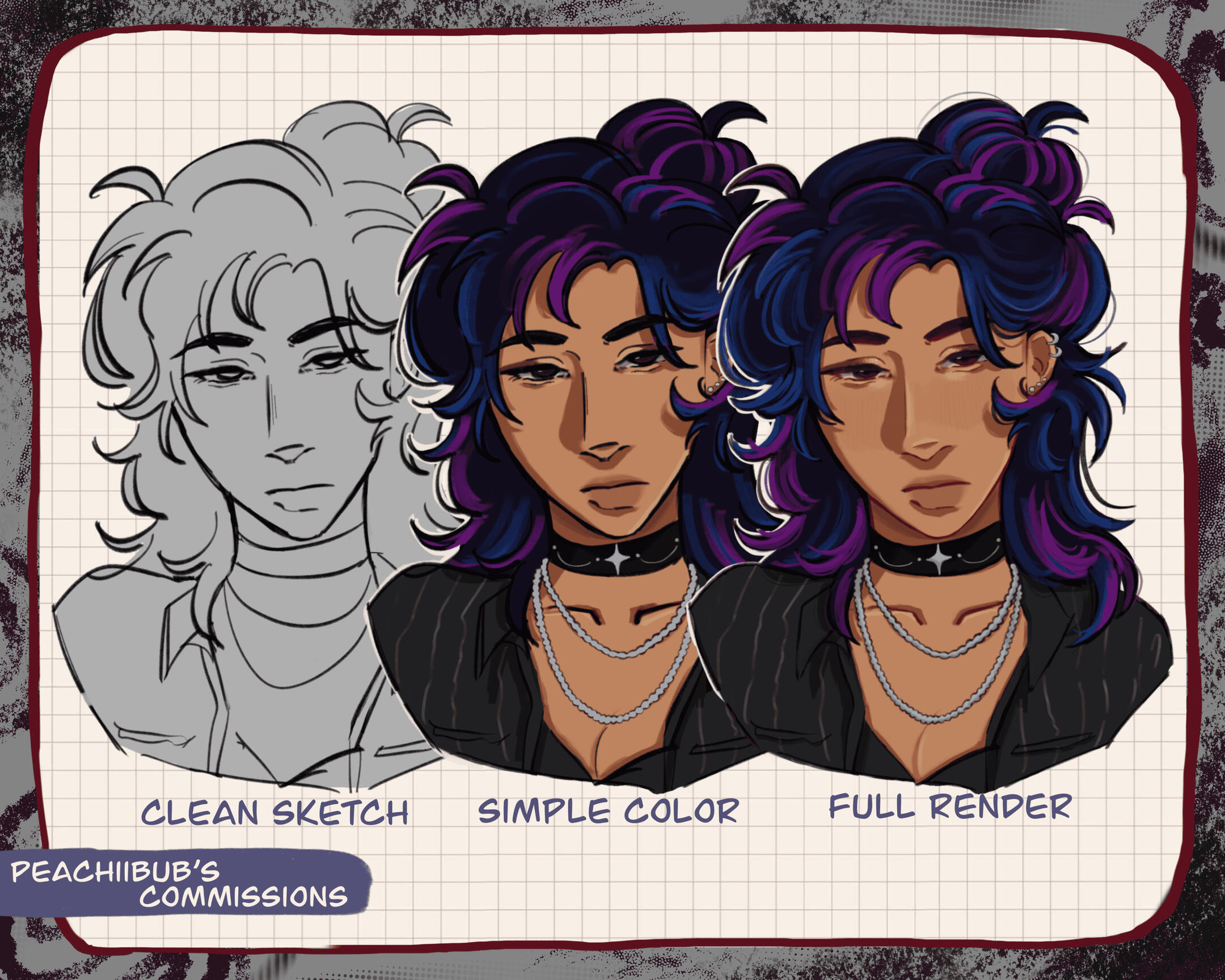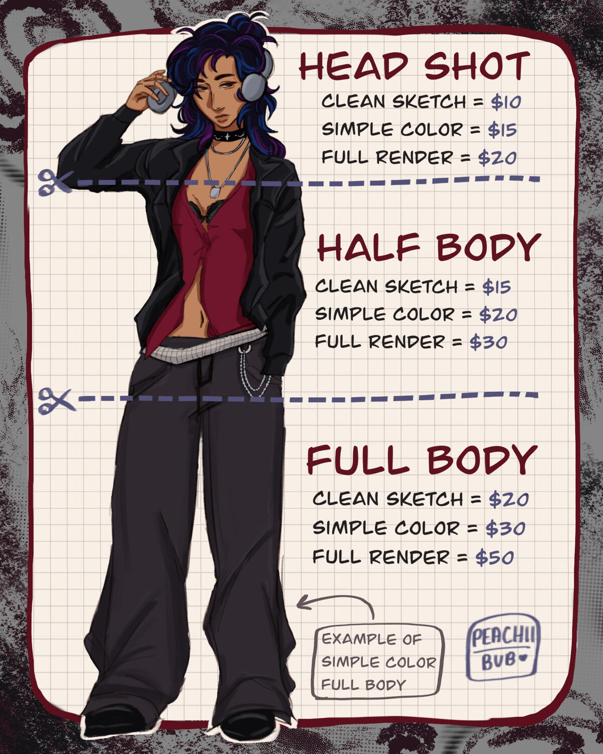 • Prices listed are base prices and may increase depending on complexity (including detailed backgrounds and complex character designs).